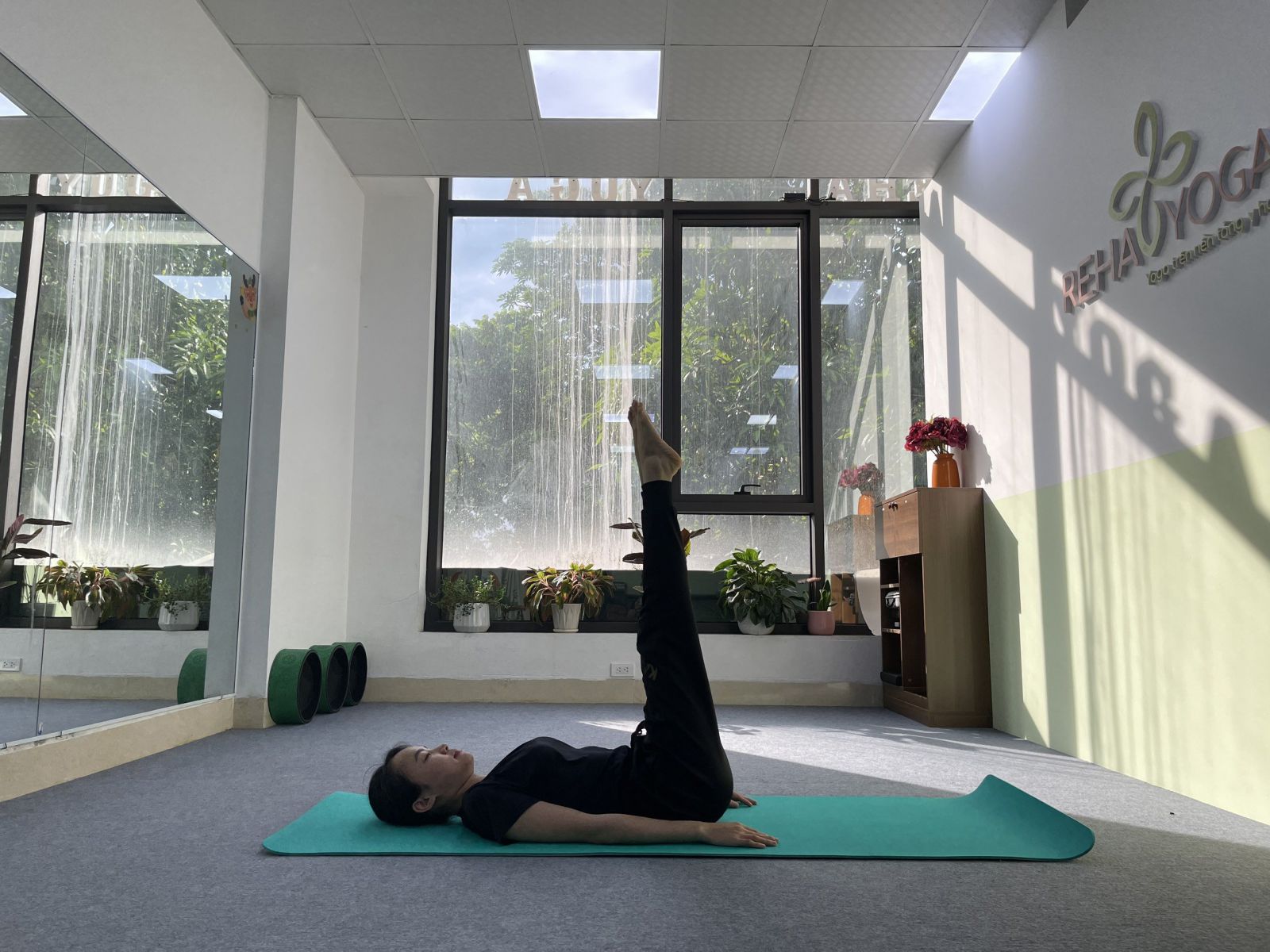 - Từ từ nâng chân phải lên cao, giữa chân càng thẳng càng tốt, tuy nhiên lưng không được rời khỏi sàn nhà. Để đảm bảo chân phải được giữ thẳng, người tập có thể sử dụng một dây cố định chân phải và hai tay. Sau đó từ từ nâng chân trái thẳng lên.