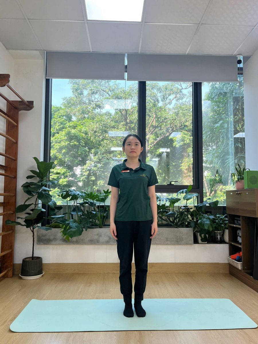 - Đứng thẳng, dồn trọng tâm sang chân phải.