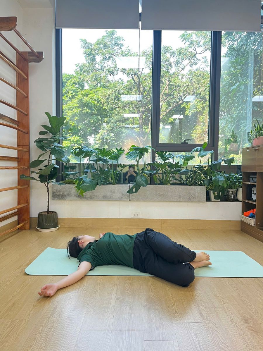 - Hạ hai gối sang một bên, đầu xoay sang bên ngược lại.