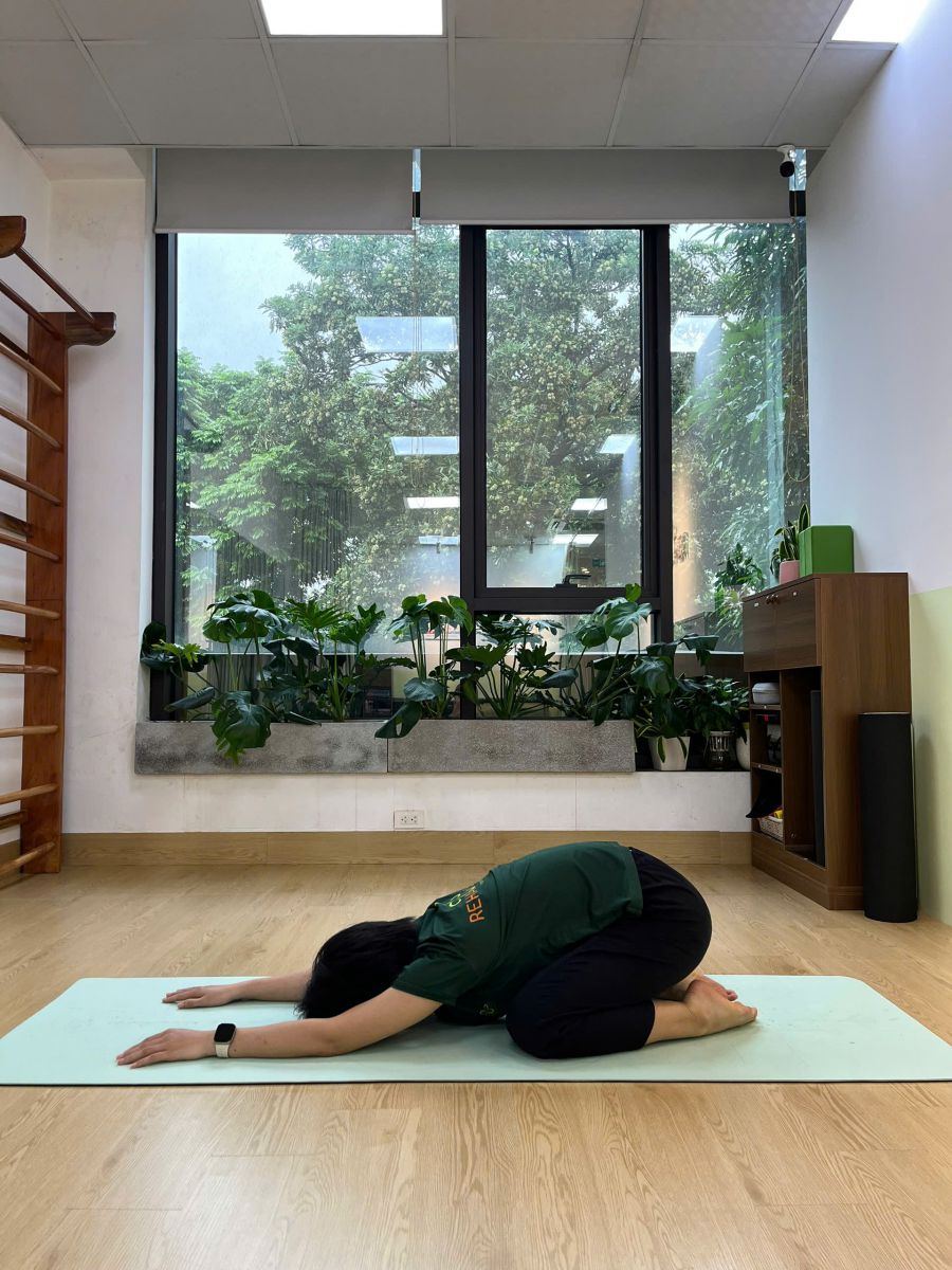 - Ngồi quỳ, gập người về phía trước, trán chạm thảm.