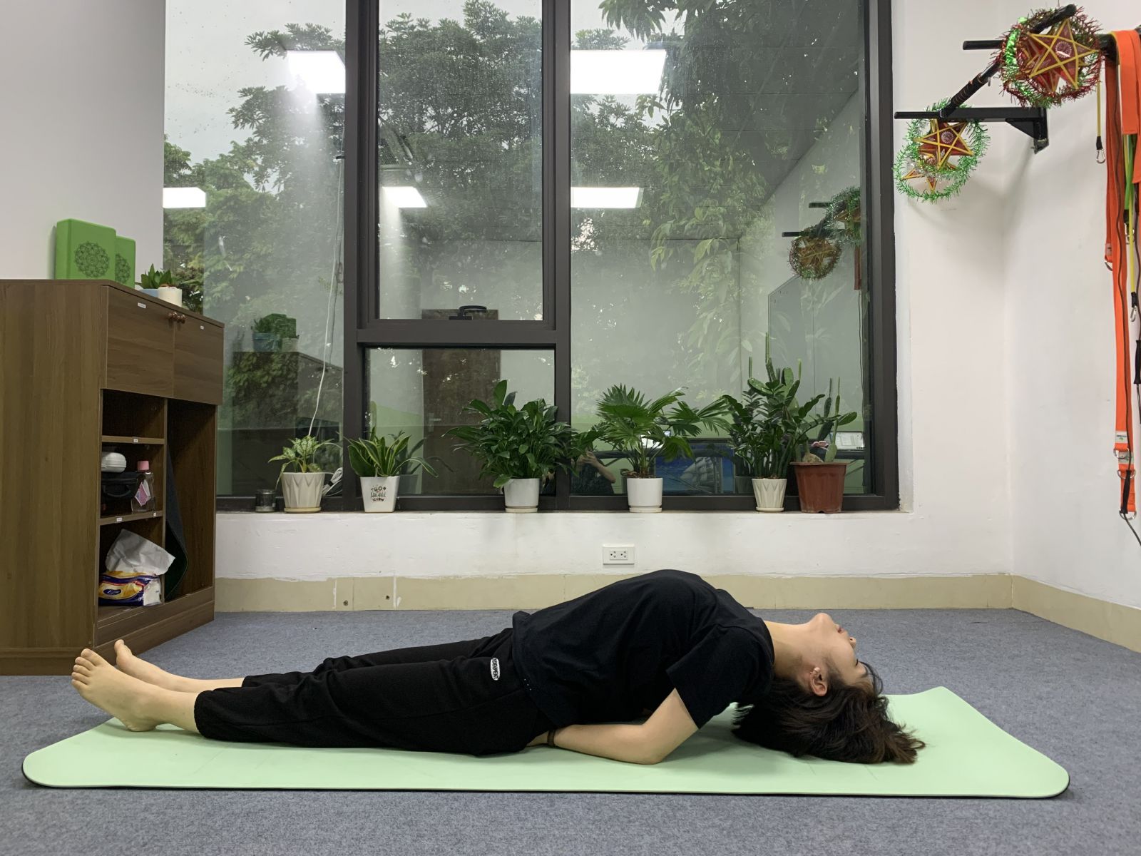 - Nằm xuống sàn, hai chân đặt cạnh nhau, 2 tay để xuôi theo thân