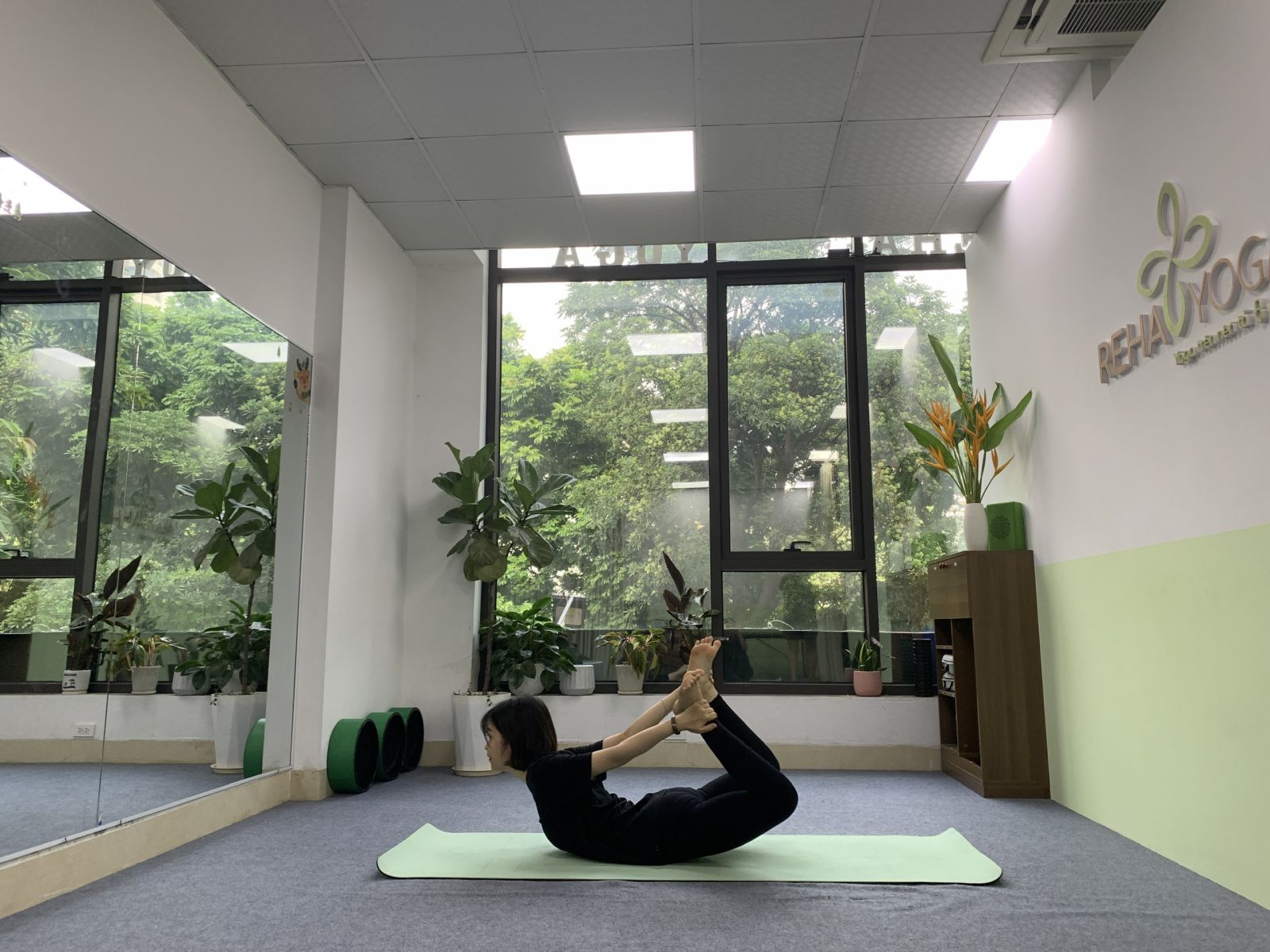 - Nằm sấp trên sàn, co 2 đầu gối lên trên, 2 tay duỗi thẳng ra sau nắm lấy 2 cổ chân, dùng lực của chân để kéo 2 căng tay ra sau